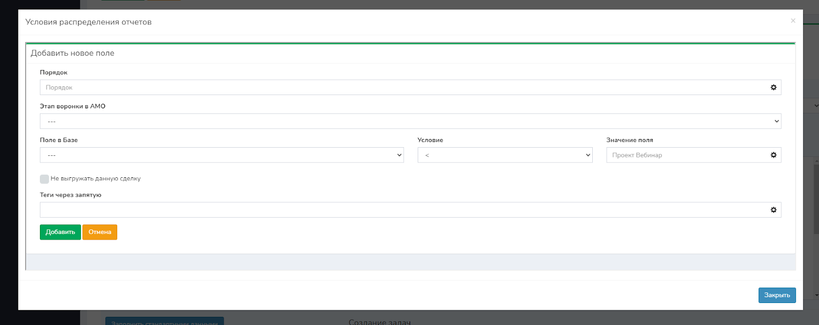 Галочка «Не выгружать данную сделку» — если отметить галочку, при заданных вами условиях, сделки не будут выгружаться в amoCRM.