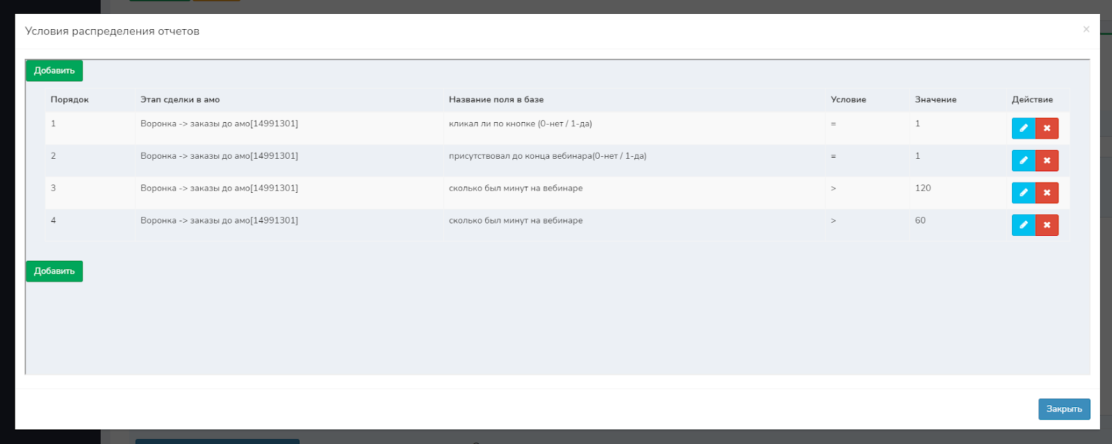 Например: Есть три этапа «Кликал ли по кнопке», «Присутствовал до конца вебинара», «Сколько был минут на вебинаре». Самое горячее «Кликал по кнопке», значит это правило должно выполняться в первую очередь, если выполнилось, остальные этапы игнорируются. Если не правильно распределить порядок, к примеру первым поставить «Присутствовал до конца вебинара», то лид, который кликал по кнопке попадет не в тот этап и вы не узнаете, что он самый «горячий».