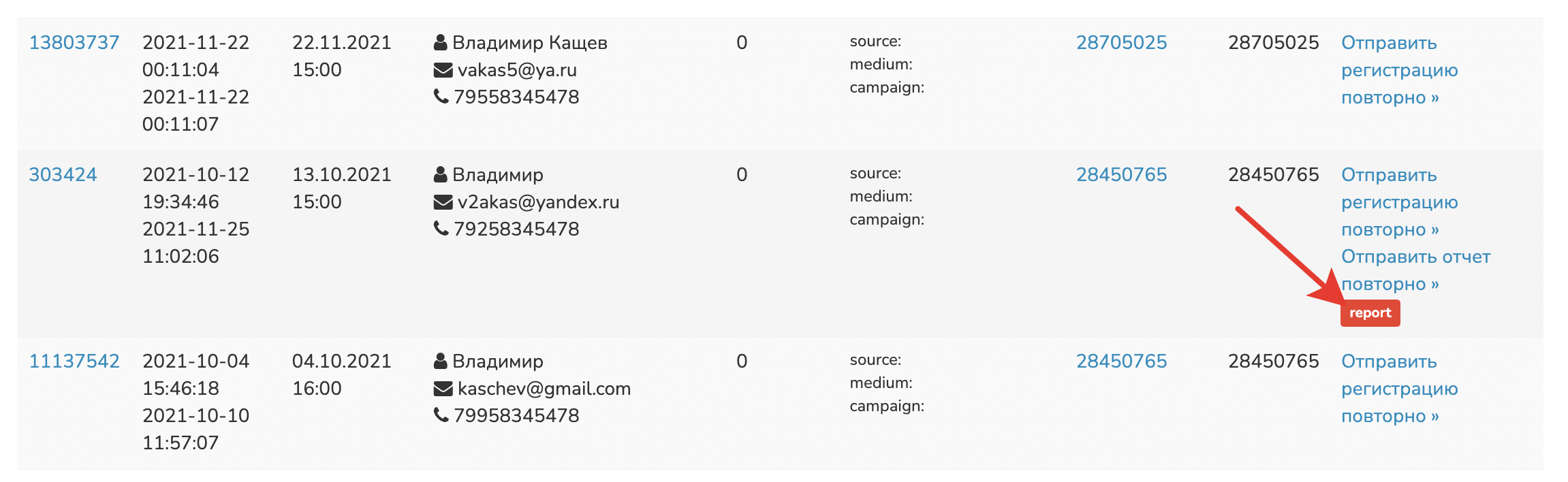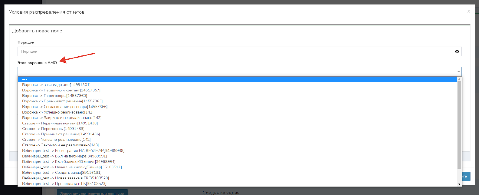 В этап «Неразобранное» (этап по умолчанию в amoCRM) нельзя передать регистрации, отчеты и оплаты.