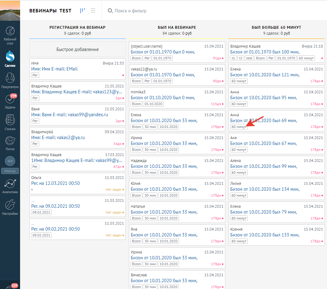 Например: клиент был на нескольких вебинарах, позвонили, отказался, вы закрыли сделку. Позже, он снова посетил ваш вебинар. И чтобы у вас не создавалась новая сделка, было видно всю прошлую историю и было понимание, как вести диалог.