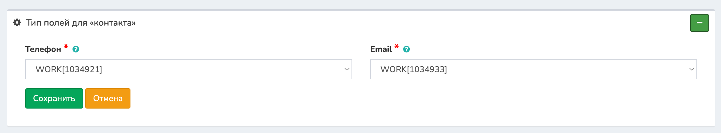 Настройки полей для «контакта», выбрать тип поля, который будет создаваться у контакта.