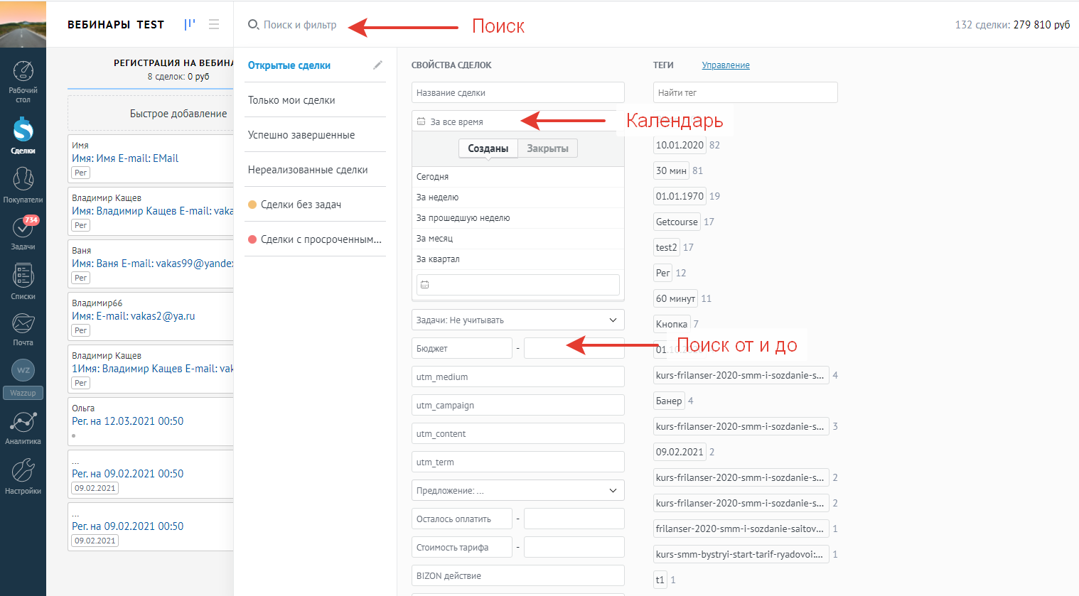 - Если ничего не выбрано, поиск идет по всем воронкам.