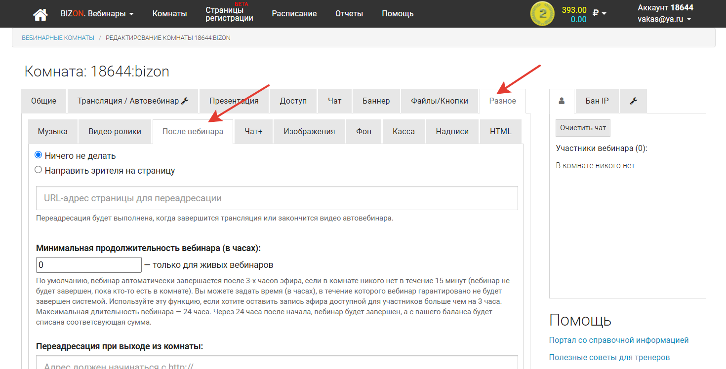 4 Нажмите Вебинары → Настройки комнаты → Больше настроек → Разное