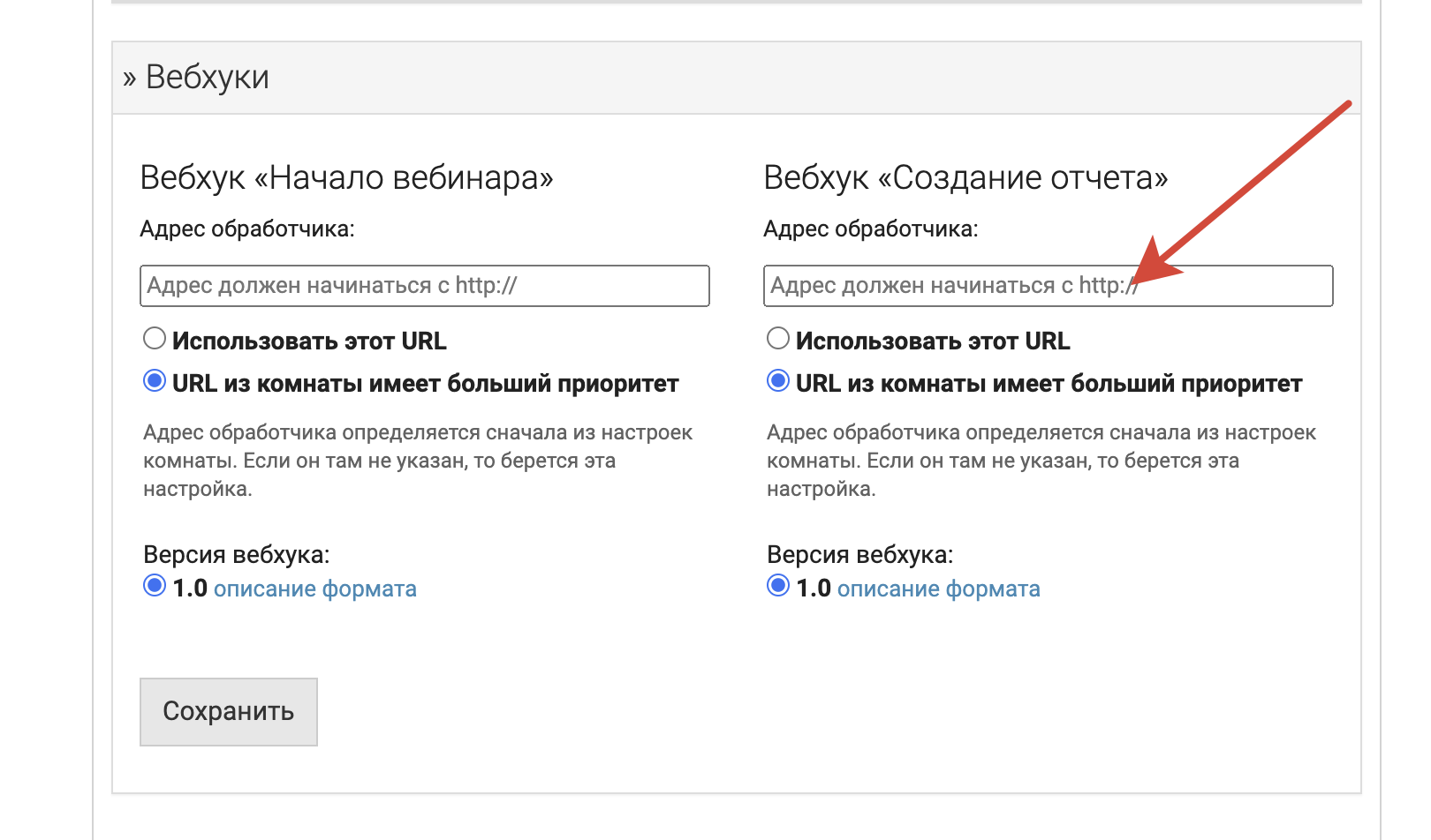 Также необходимо проверить, чтобы в общих настройках не было указано вебхуков. Заходите Вебинары → Домены и общие параметры → Вебхуки и проверяете, чтобы поле было пустым, иначе вебхук в комнате будет не приоритетным и отчеты автоматически не передадутся.