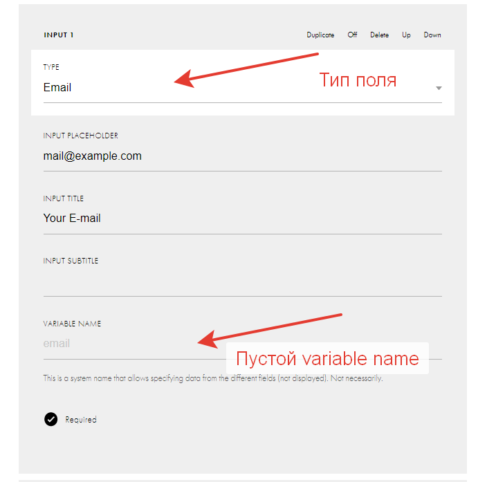 ВАЖНО! У полей у формы, должен быть variable name пустым. Но должен быть выбран соответствующий тип.