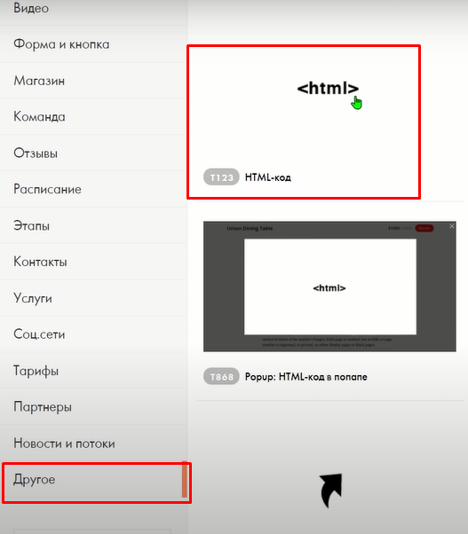 Скопированную ссылку ставим на свой сайт, покажем на примере сайта на Тильде. На Тильде из раздела Другое, выбираем блок Т123
