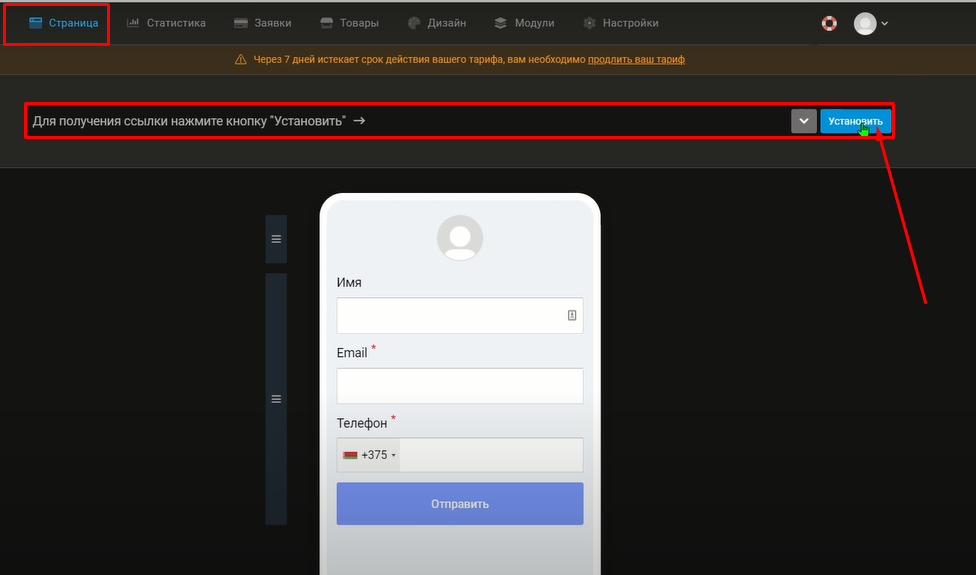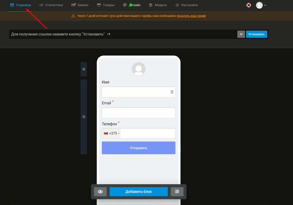 Для передачи данных по webhook нужно установить ранее установленную ссылку - webhook. Для этого переходим на вкладку Страница и нажимаем кнопку [Установить].