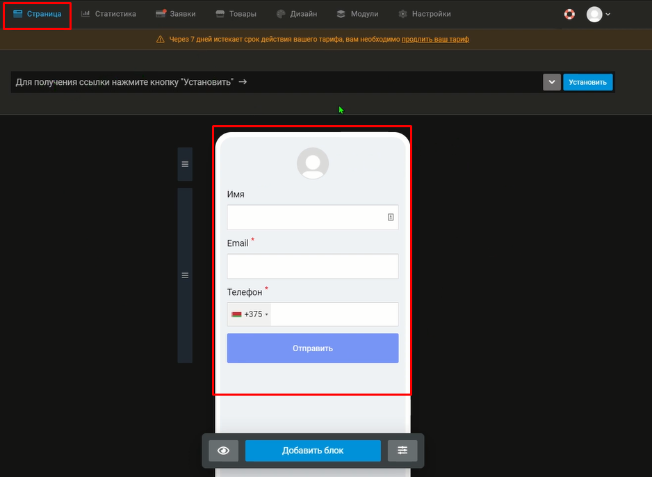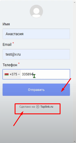 Если вы собираетесь передавать заявки или оплаты со страницы Taplink, у вас должна быть создана форма сбора данных на Taplink. Для примера мы уже создали страницу с формой.
