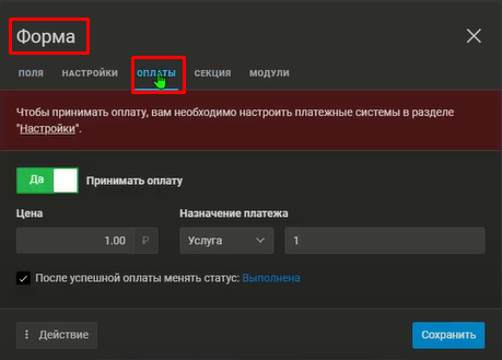 Выбираем вкладку Оплаты. Платежная система должна быть уже подключена и настроена. Бегунок отмечаем - принимать оплаты в положении Да, прописываем цену, выбираем назначение платежа и нажимаем [Сохранить].