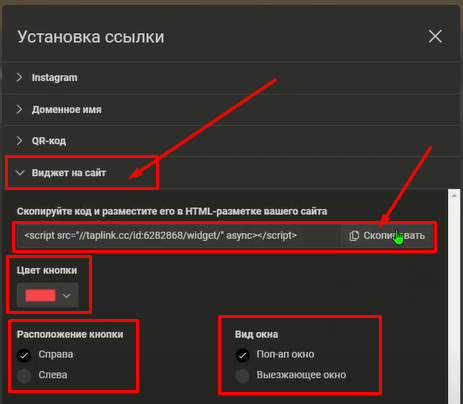 Для этого нажимаем вкладку Виджет на сайт. В открывшемся окне настраиваем визуал виджета, и копируем скрипт для постановки на сайт.