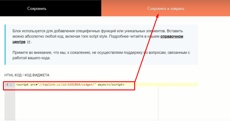 В добавленном блоке нажимаем кнопку [Контент] и вставляем туда скопированный на Taplink скрипт.