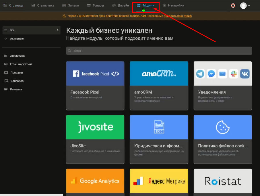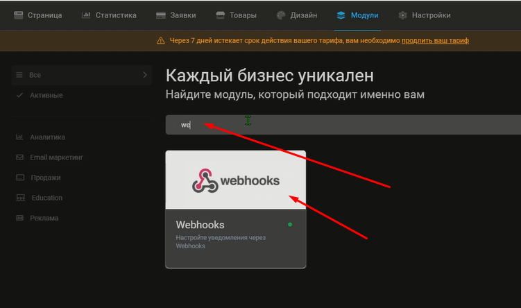 Когда страница создана, и поля настроены, переходим в раздел Модули на Taplink и в строке поиска вводим Webhook.
