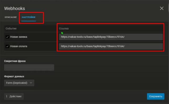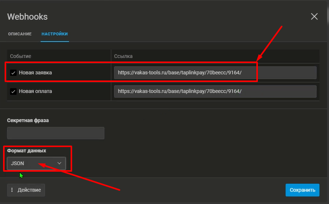 Возвращаемся на Taplink и вставляем скопированную ссылку - webhook в нужном поле. ВАЖНО! Если у вас несколько Баз, используйте ссылку - webhook  от нужной Базы