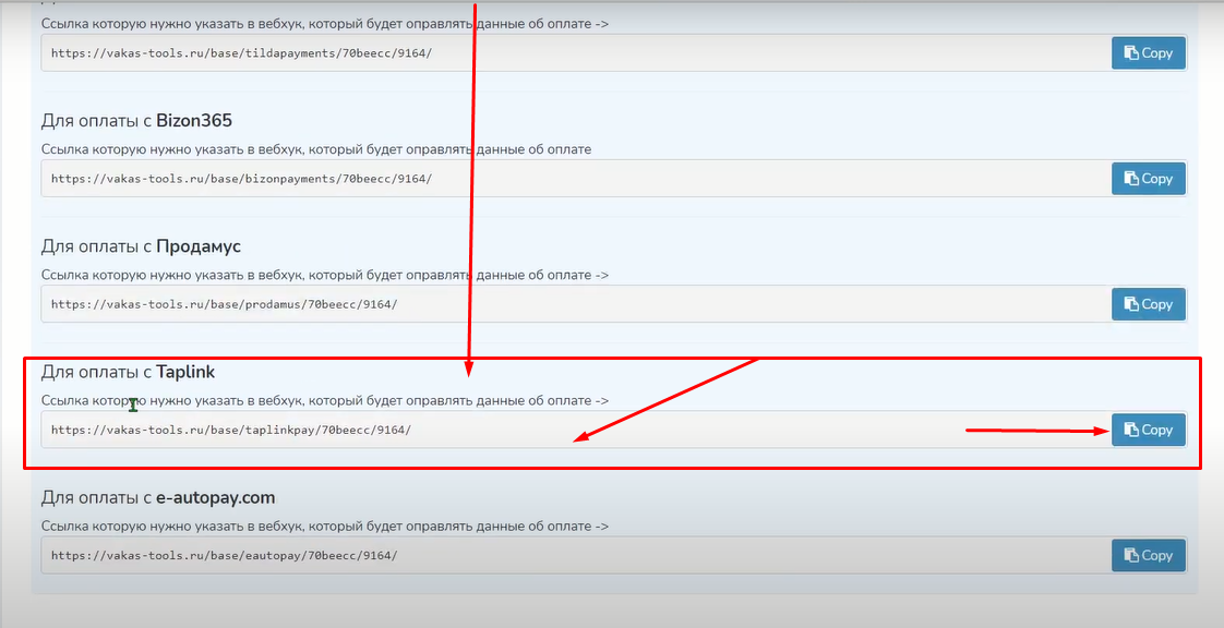Пролистываем ниже и копируем ссылку для оплаты с Taplink.