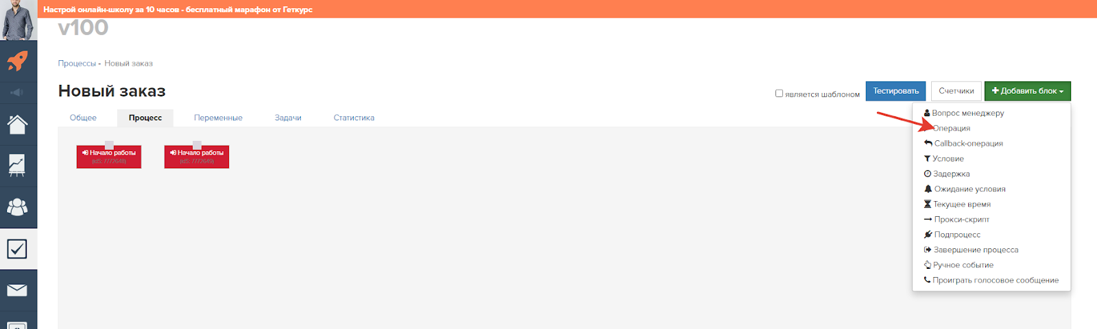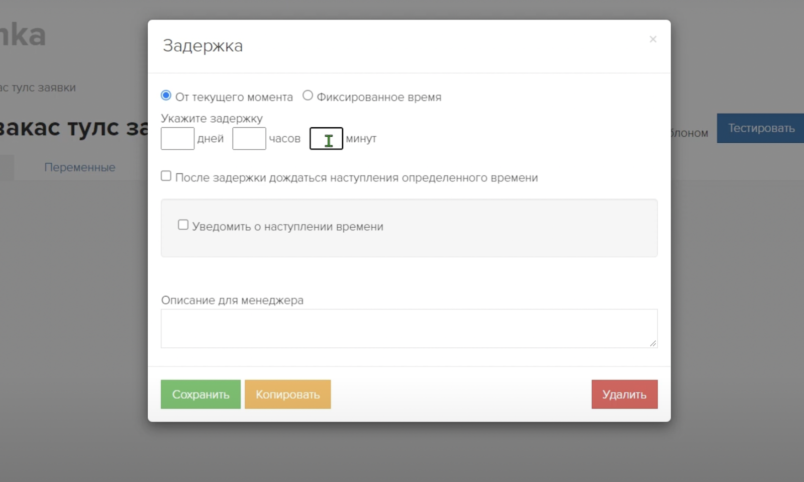 Переходим к процессам. Создаем первый блок Задержка, ставим 10-15 минут