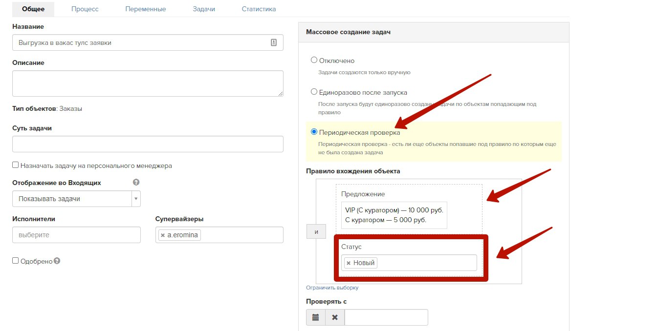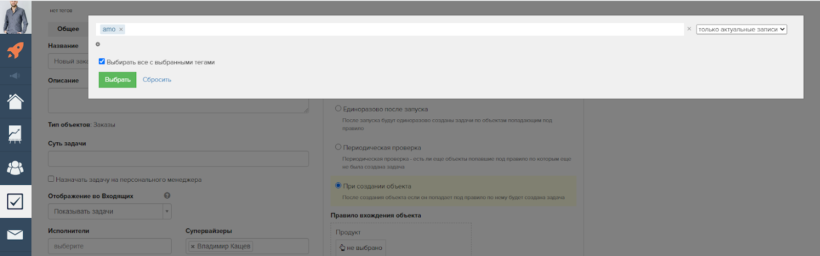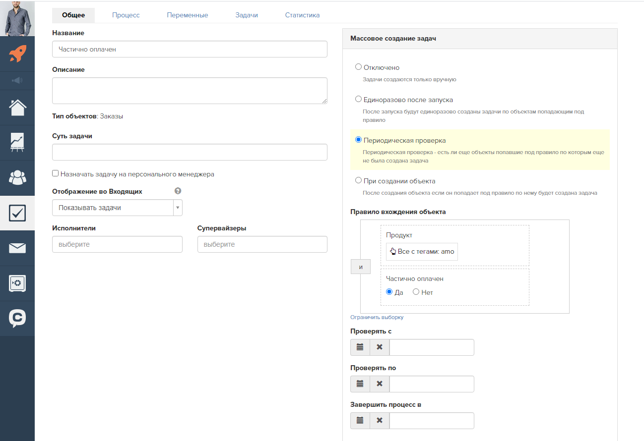 Массовое создание задач: Периодическая проверка. Правило вхождения объекта (условие): Частично оплачен. На примере: Все Продукты с тегами amo попадут в процесс. Дополнительно можно добавить и другие условия.